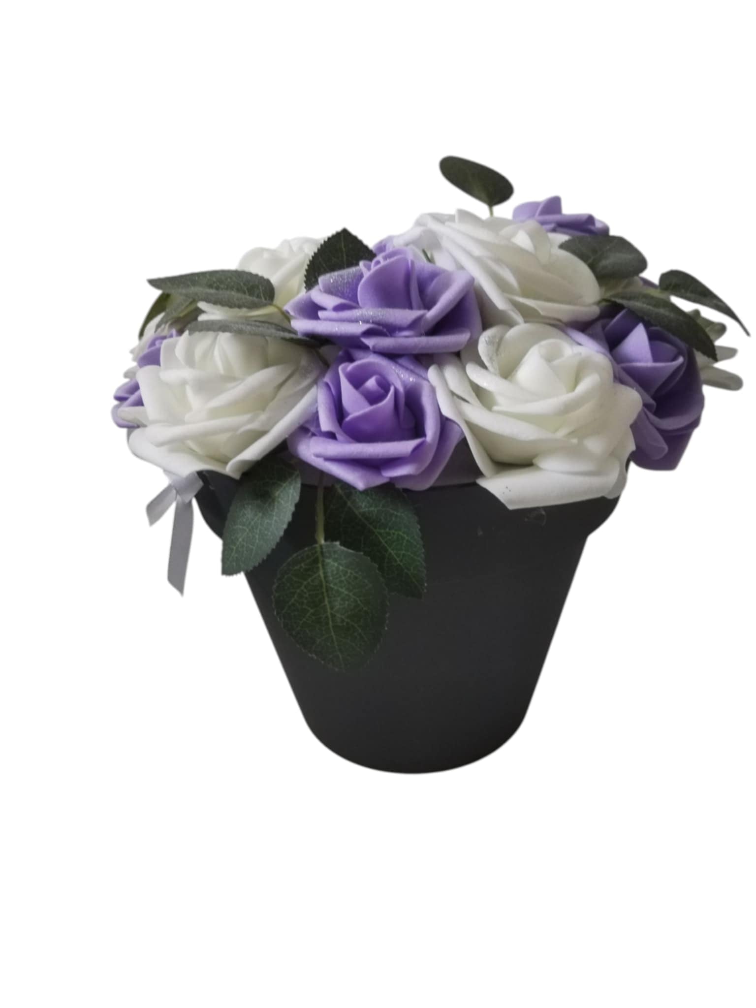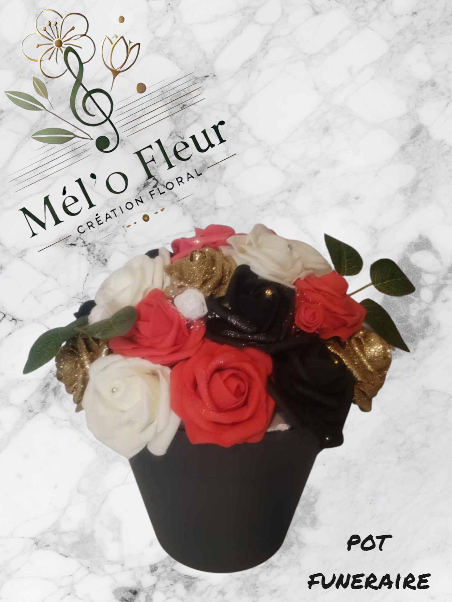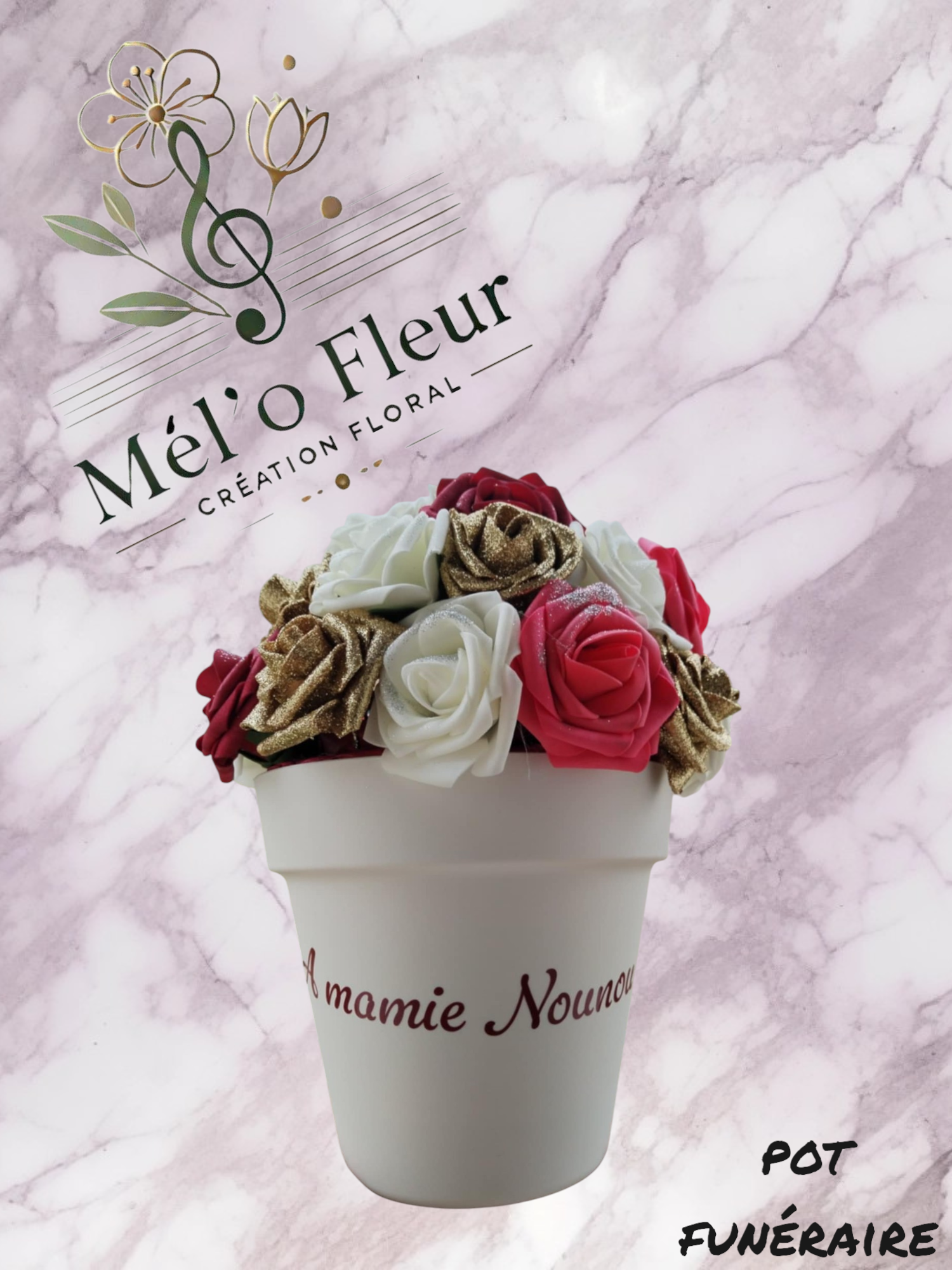 Le pot funéraire est une composition funéraire avec son mélange de roses et de fleurs est adapté pour l'extérieur. elle a une durée estimé entre 6 mois. Cette composition ne bouge pas elle est réalisée exprès, il y a un poids a l'intérieur. Je le fait à la main artisanalement.
