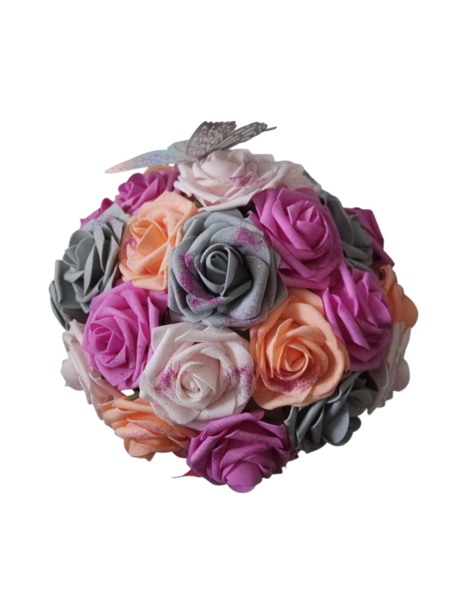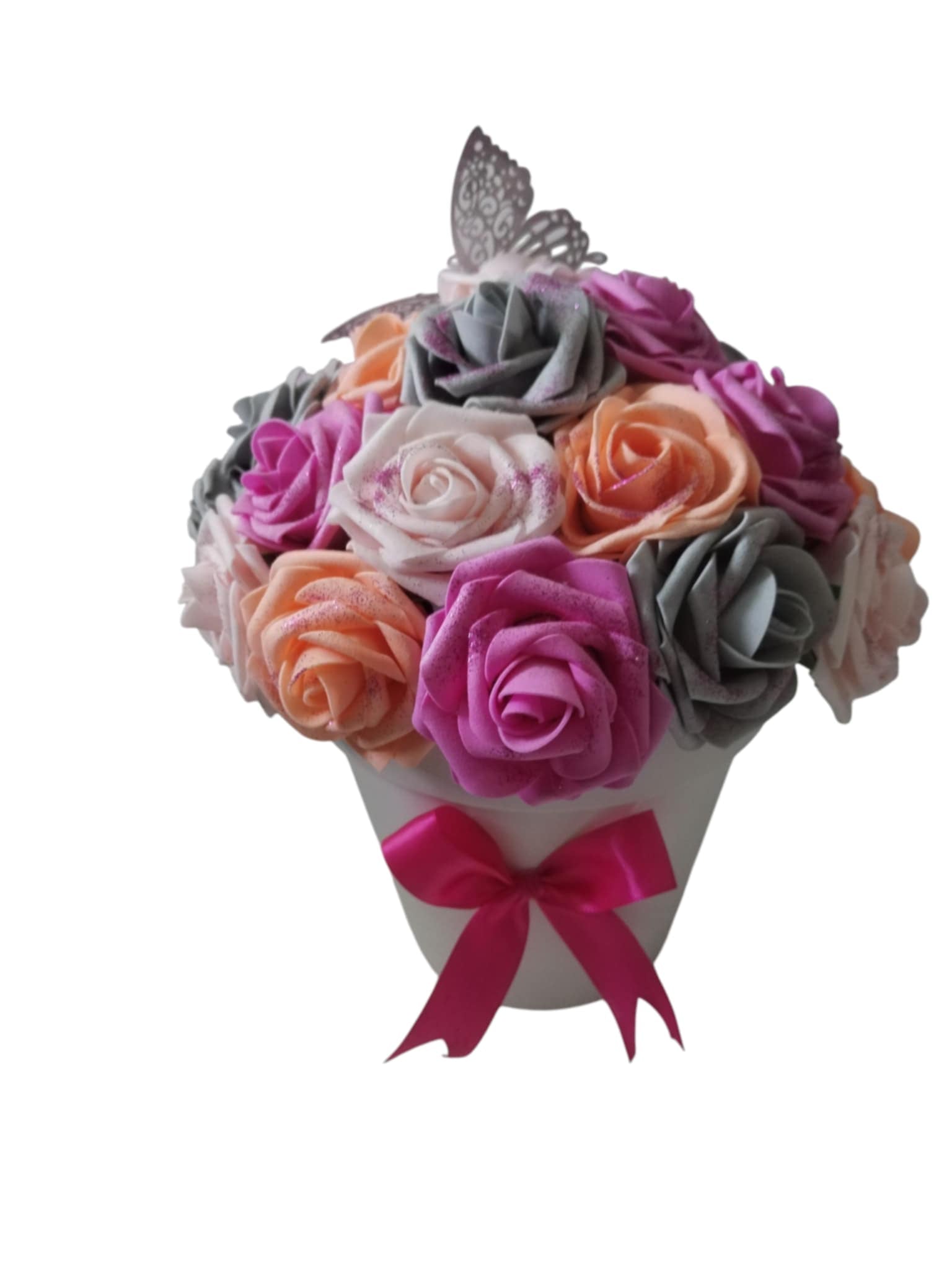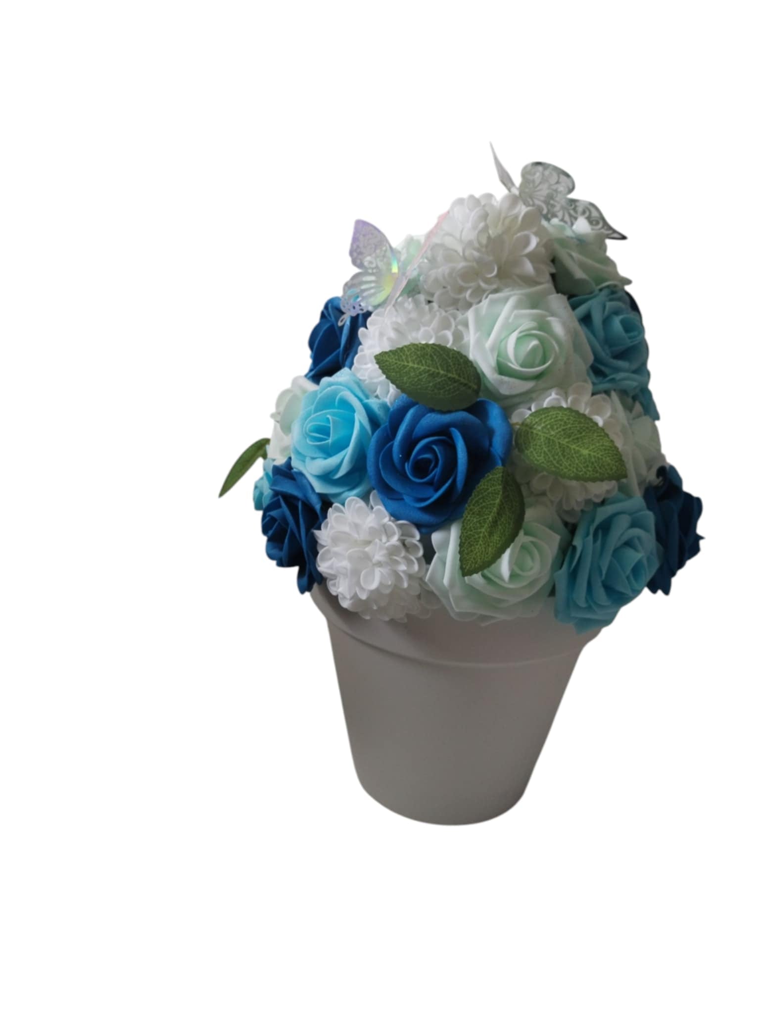 Le pot funéraire est une composition funéraire avec son mélange de roses et de fleurs est adapté pour l'extérieur. elle a une durée estimé entre 6 mois. Cette composition ne bouge pas elle est réalisée exprès, il y a un poids a l'intérieur. Je le fait à la main artisanalement.